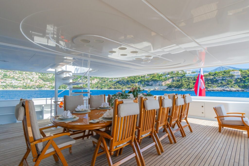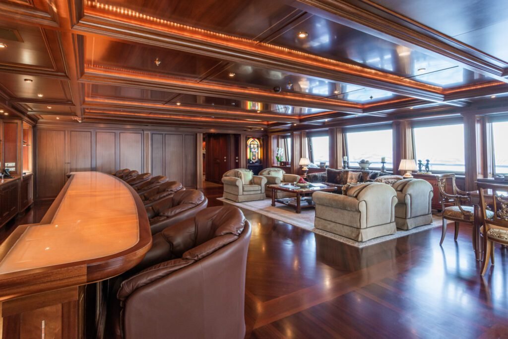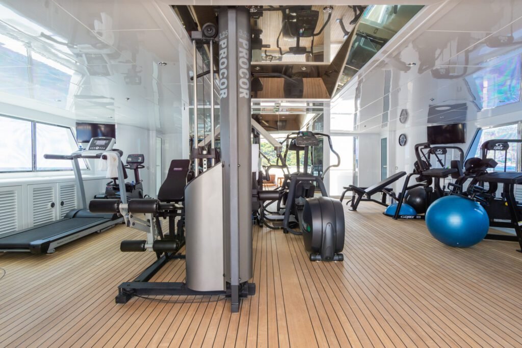 APOGEE not only exudes sophistication and luxury but also serves as the ultimate yacht for entertainment. The expansive deck areas surpass those of competitors, equipped with chaise longues featuring built-in speakers, a 12-person Jacuzzi, and multiple sunbathing spots. The highlight is the 22ft onyx-topped bar, inspired by the iconic Cafe de Paris in Monaco and Miami’s Delano Hotel, complete with a dance pole and a 60-inch flat-screen TV. The space also includes a dance floor, a Wurlitzer jukebox, and a karaoke machine among other entertainment options. At dusk, the sundeck transforms into the vibrant outdoor nightclub, “Club Apogee”. For fitness enthusiasts, there is an impressive air-conditioned gym located on the top deck, offering breathtaking panoramic views.