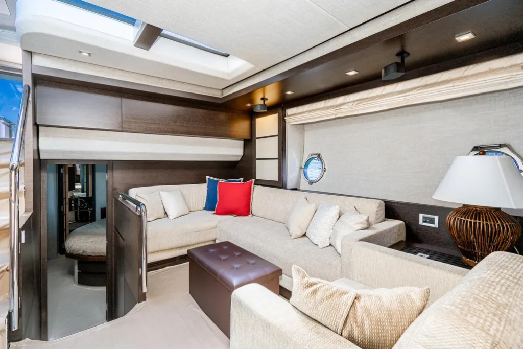 The Azimut 62 Sport salon offers an elegant yet sporty ambiance, characterized by soft white sofas, contrasting furnishings, and bright colors. Its hard top roof retracts, providing seamless inside/outside living both day and night. The main deck, including the salon, forms a 28-square-yard “sea terrace.”