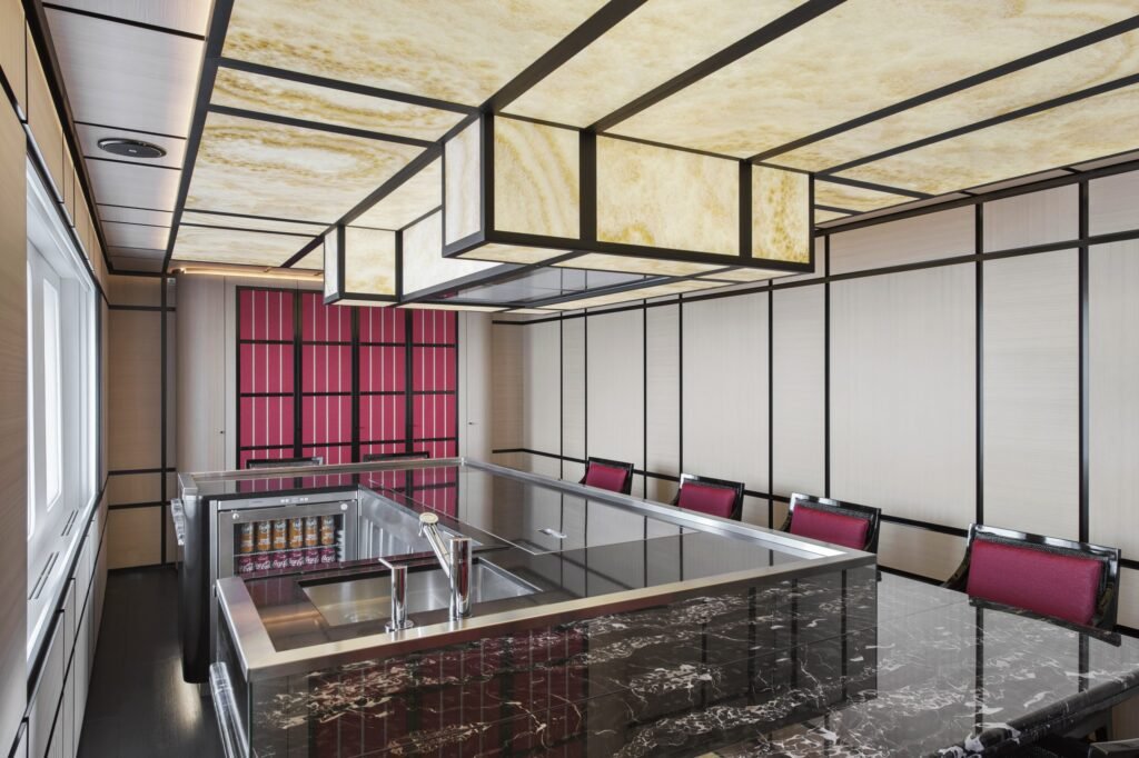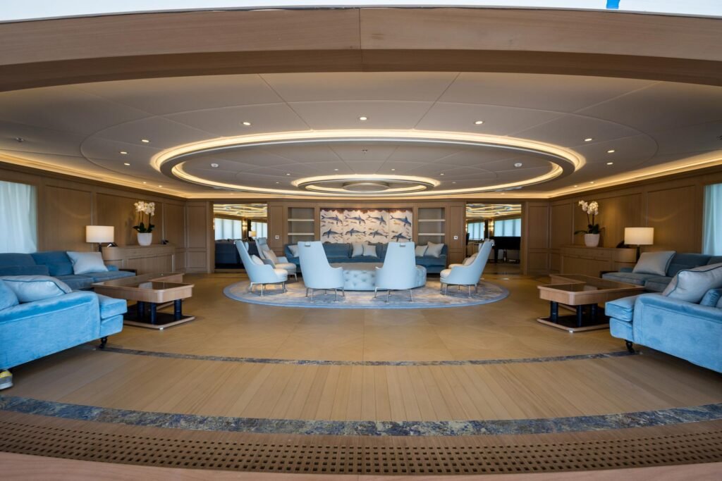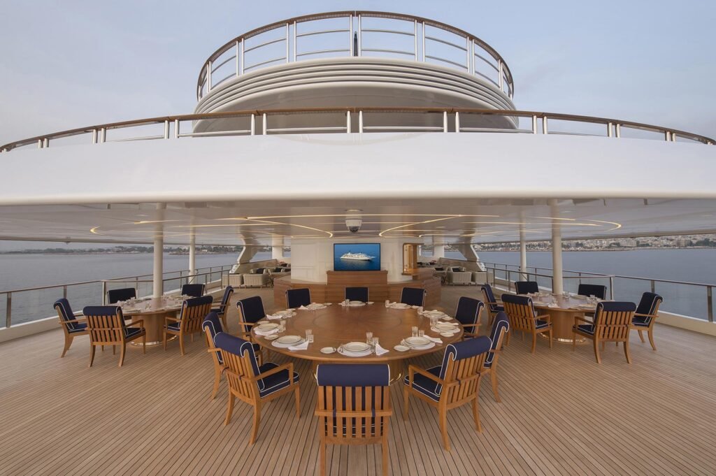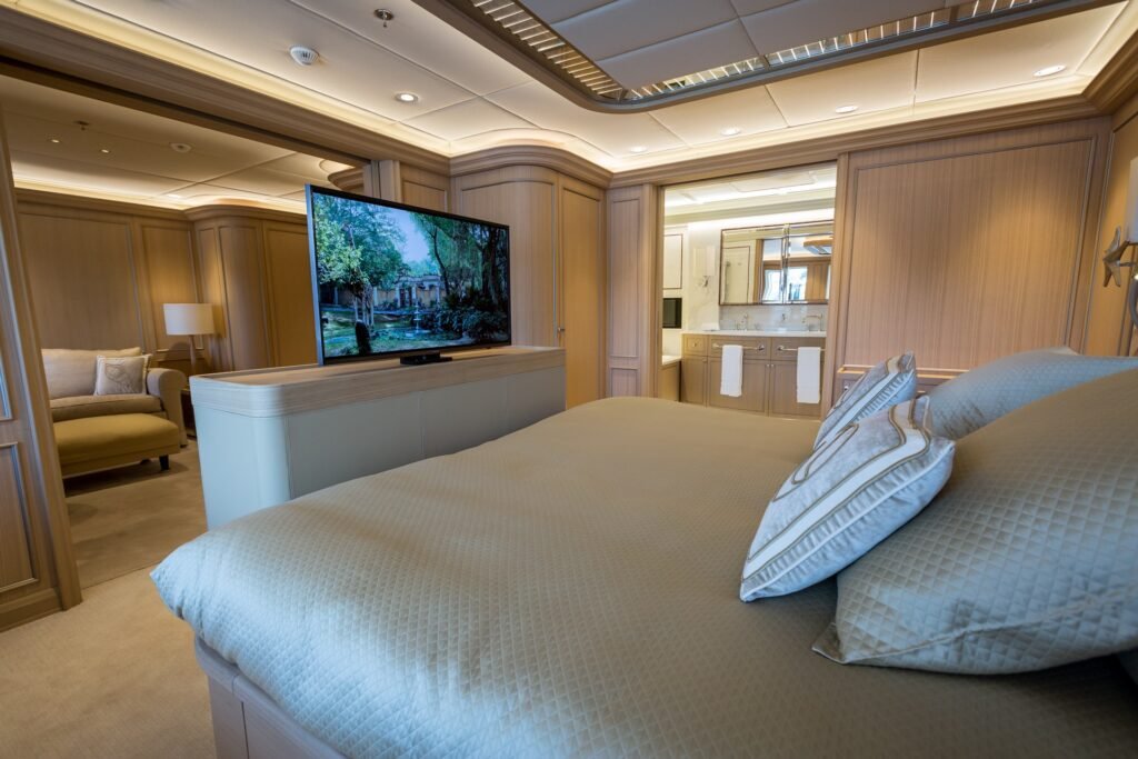 Entertainment is seamless thanks to an advanced audiovisual system operated via iPads, giving guests full control over music, TV, lighting, and blinds throughout the yacht.