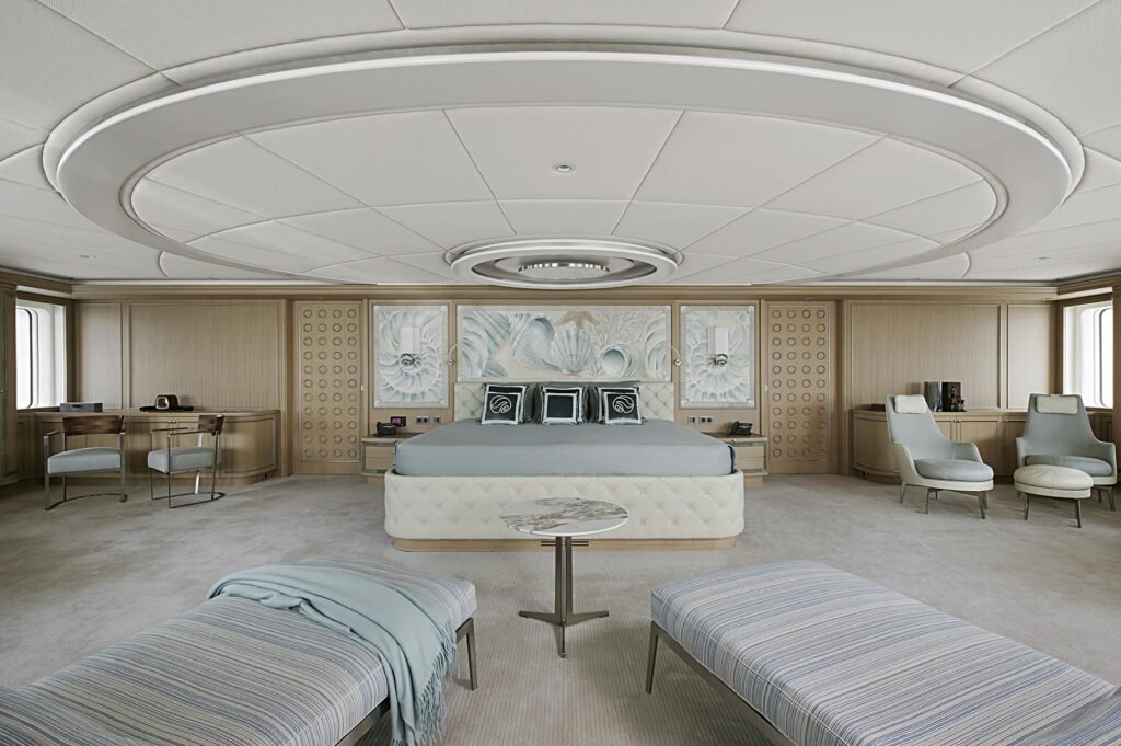 For outdoor enjoyment, there’s an aft beach club at the water’s edge, a swim-up bar on the top deck, and numerous sun pads and sofas across her decks for relaxed lounging.
