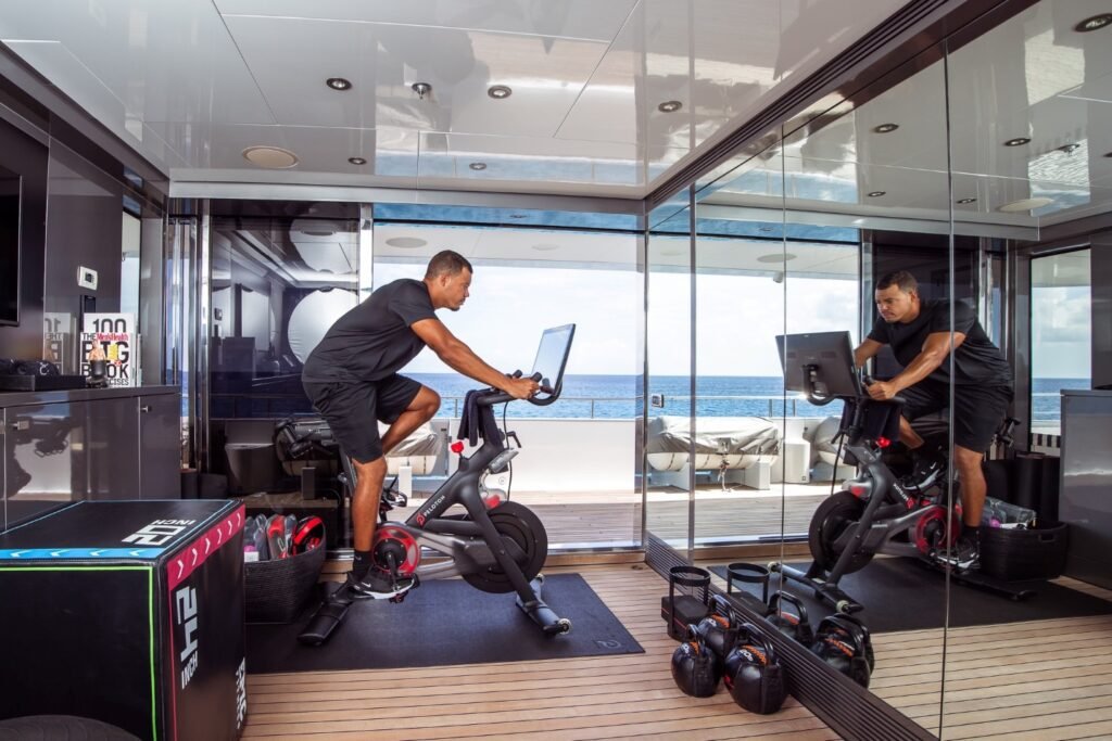 Onboard amenities also include a sun deck gym equipped with a Peloton bike and a variety of fitness gear, alongside a sophisticated audio-visual system integrated throughout the yacht.