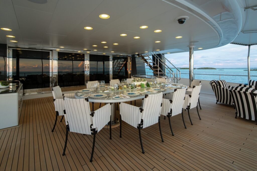 As guests step aboard Eternity, they are welcomed by a generous aft deck lounge and full-height glass doors that open into the elegant main saloon. A central elevator provides access to the upper deck, where a vast al fresco dining area, a refined formal dining room, and flexible entertainment spaces await.