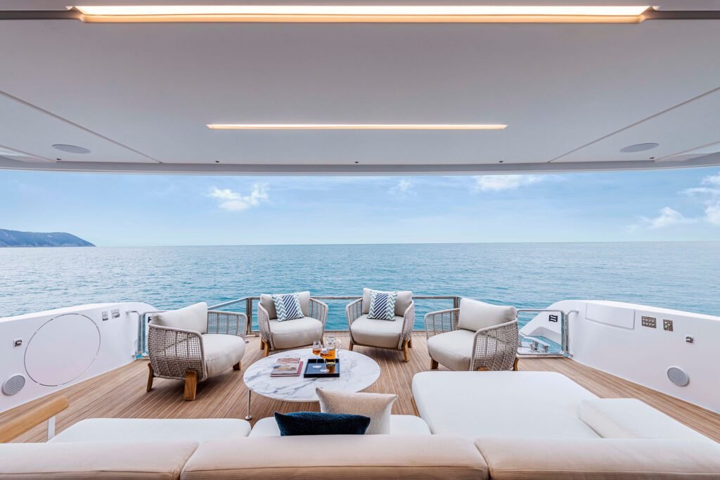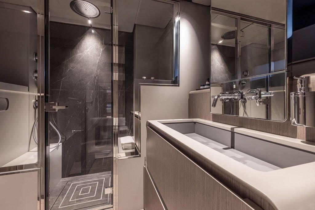 Onboard, guests can indulge in a variety of experiences, including a deck jacuzzi, perfect for savoring the scenery with a refreshing drink. To ensure ultimate comfort, Ferretti Infynito 90 is equipped with air conditioning throughout.