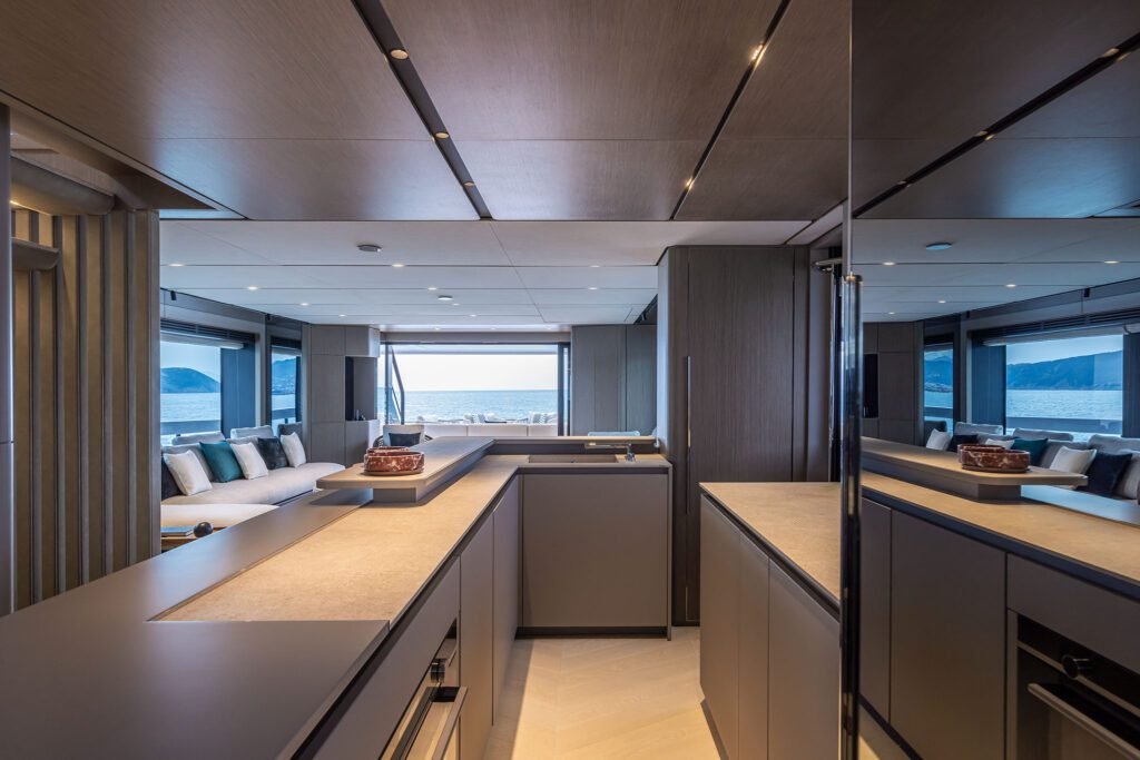 Powered by a GRP hull and superstructure, Ferretti Infynito 90 cruises comfortably at 15 knots and can reach a maximum speed of 22 knots. Her impressive range of 1,200 nautical miles at 12 knots is supported by her 11,500-liter fuel tanks.