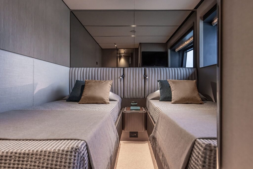 Ferretti Infynito 90 embodies the ideal luxury charter experience, showcasing a clever utilization of space with a seamless integration of advanced systems and opulent features, sure to delight all who step aboard. Her guest accommodation includes a supremely spacious full-beam master suite with an extensive dressing room, a VIP cabin, a double cabin, and two twin cabins. Furthermore, she carries a professional crew of four, ensuring a relaxed and pampered charter.