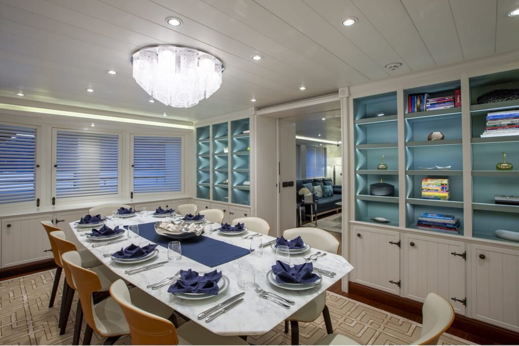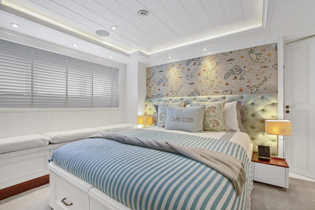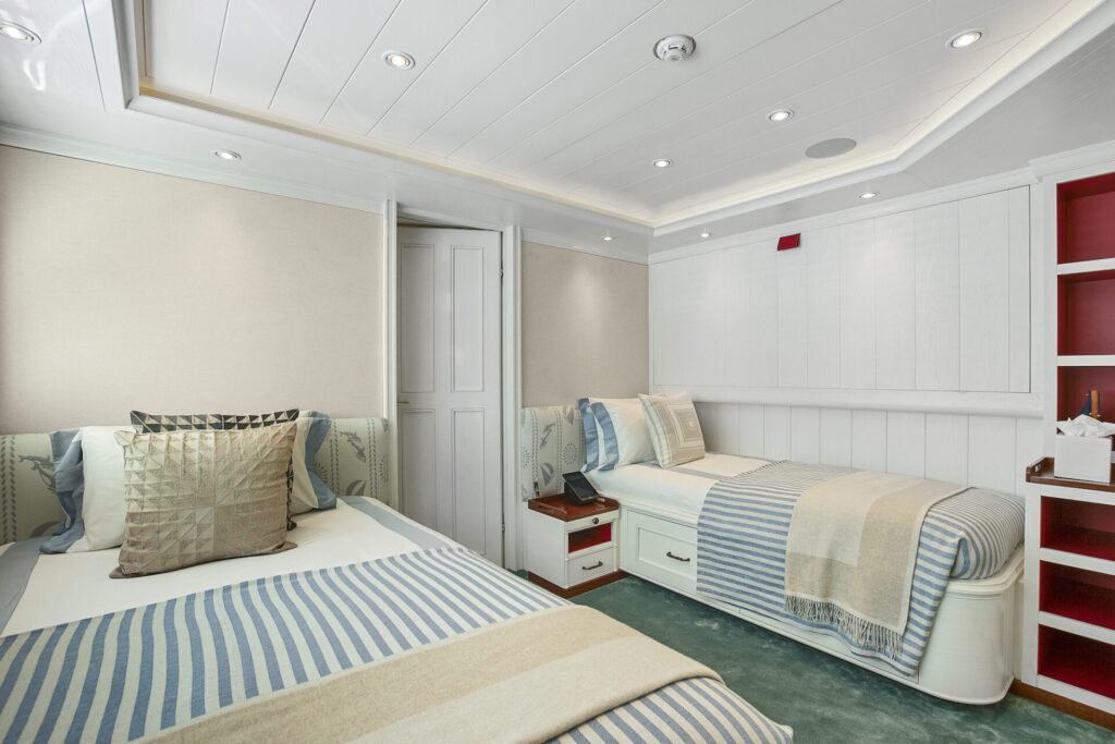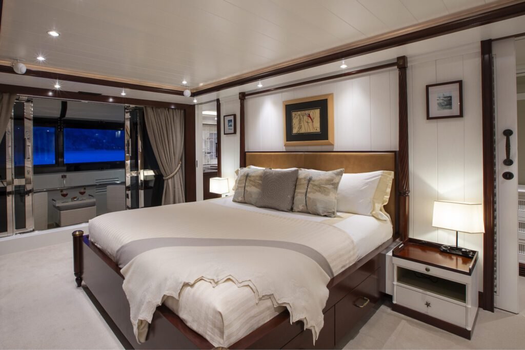 Accommodation is provided for up to 11 guests across five cabins, including a master suite with an adjoining study, three VIP double cabins, and a twin cabin with an extra Pullman bunk.