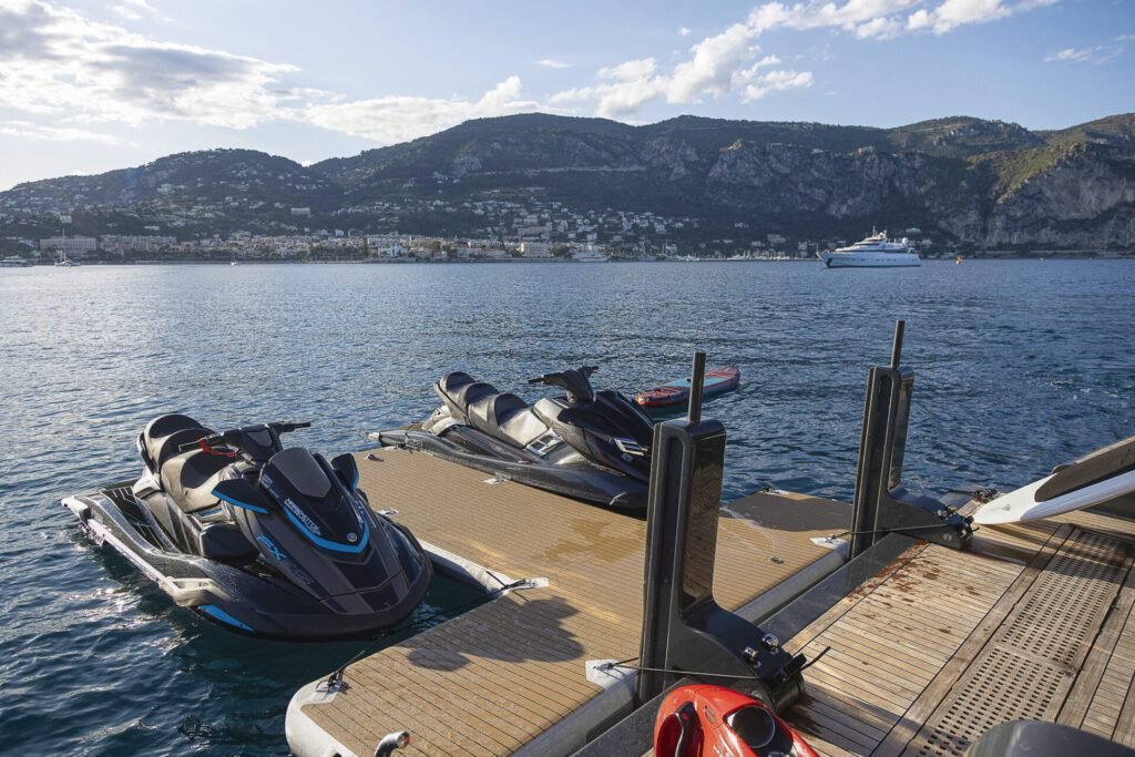 Key features aboard LADY TRUDY include a sundeck with a Jacuzzi, an outdoor cinema and cocktail bar, a well-equipped gym, and a spacious swim platform offering easy water access, along with an extensive collection of water toys, highlighted by an inflatable slide extending from the sundeck into the sea.