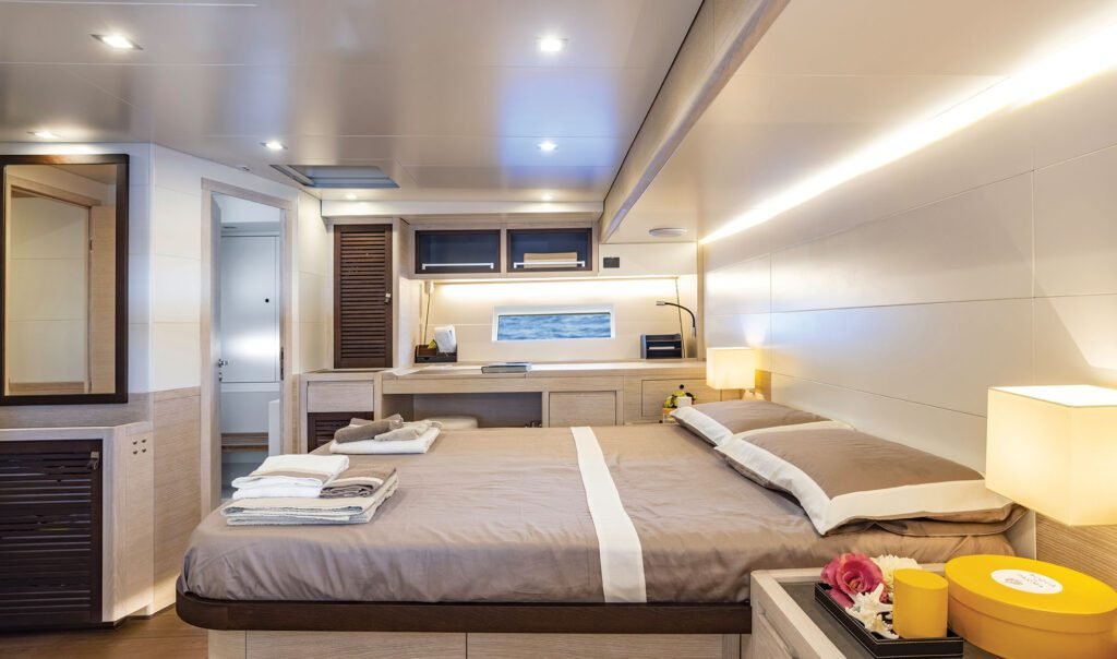Thanks to her spacious interior volumes and advanced construction methods, MINDFULNESS stands out from similar vessels. The saloon features a breathtaking skylight, and as night falls, thoughtfully designed lighting creates an inviting, cozy atmosphere. Light oak finishes run throughout, complemented by neutral upholstery. Dining can be enjoyed at the saloon’s table, with a casual breakfast bar adjacent to the galley.
