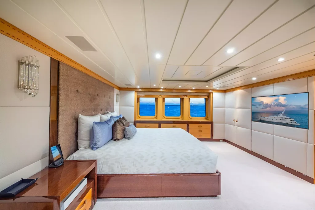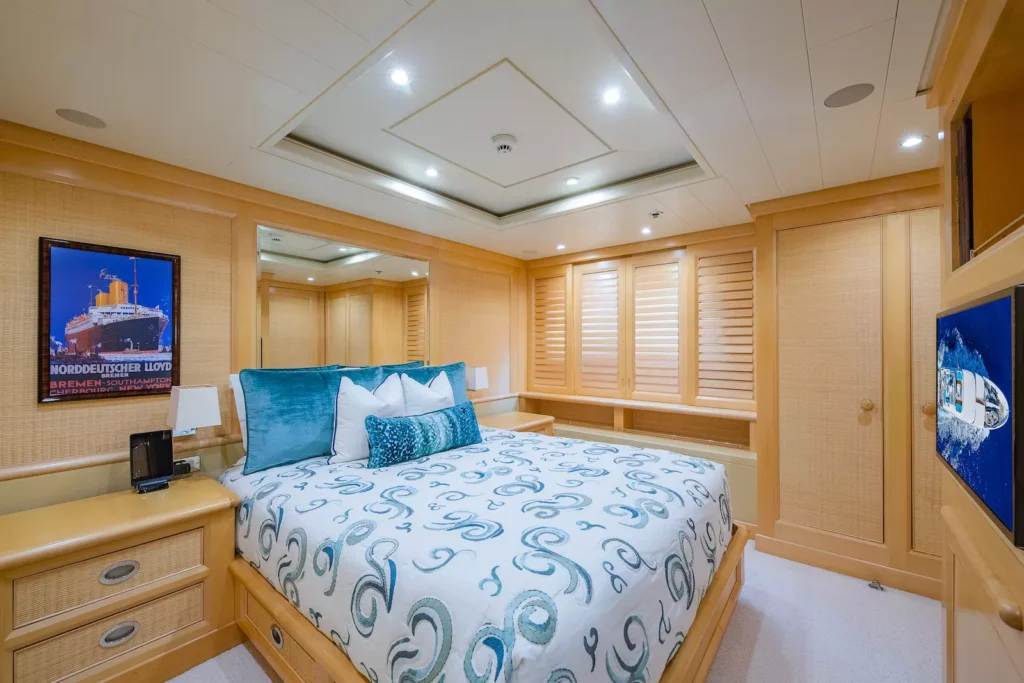 She accommodates up to 12 guests in five en-suite staterooms, including a full-beam master suite on the main deck, two VIP queen cabins, and two additional queen cabins, each with a pullman berth, perfect for families or groups.
